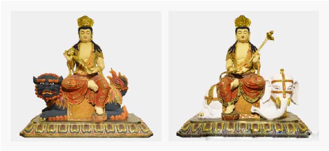 在正殿佛像背后,往往有坐南向北的菩萨像。一般是文殊、普贤、观音三大士之像,文殊骑狮子,普贤骑六牙白象,观音骑龙。