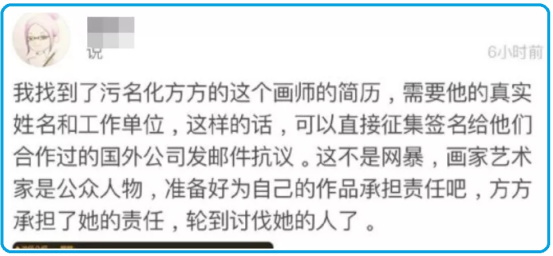 当然还有一些网友也表示不用太过担心,毕竟该画家水平很出色,粉丝也很多,应该不会受到太大影响。——如果真的不会有什么影响,当然是最好的。可是作为经历和目睹过7.23事件和帝吧少年个人信息泄露事件的我,还是希望小心警惕一些。在之前的人肉搜索威胁当中的确有当事人被流氓上门群殴,也有当事人被自己的工作单位勒令以后禁止在网络上参与公共话题,因为工作单位不堪各种电话威胁和骚扰投诉。