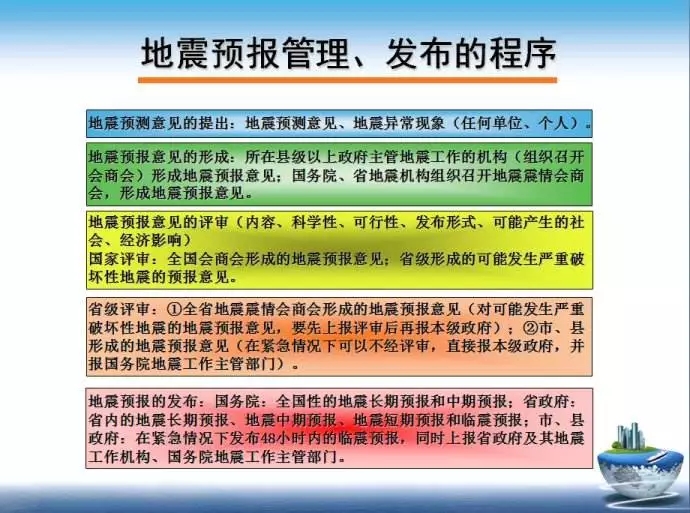 1988年,国家地震局发布《关于地震预报的规定》,规定了地震预报的发布权限:长期预报(几年到几十年)由国家地震局发布;中期(几个月到几年)由国家地震局或省级政府发布;短期(几天到几个月)和临震预报(几天)由省级政府发布,时间允许的情况下还要经过国务院批准。而地震工作者、群众测量点和测报员不得擅自散布地震预报意见等。