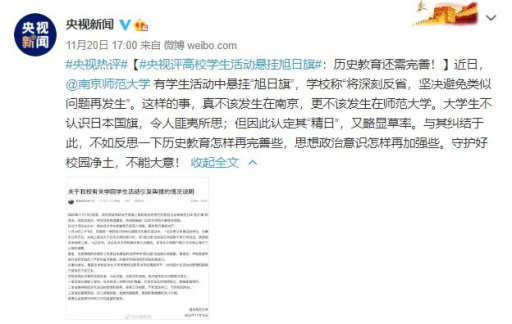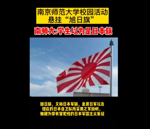 “——11月14日上午9点,在我校一学院举行的学生国际文化展示活动中,一位负责日本展位的学生,为展示日本文化,从网上查找关于日本元素的图片时,将“旭日旗”当成是日本国旗下载打印挂出,被其他同学拍照上网。10点左右,活动主办方发现展位图片问题后,该学生立即撤下图片并在网上进行了认错和道歉。