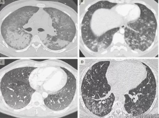 CT影像显示,患者肺部出现大量磨砂玻璃状斑块,即肺部被血、粘液等物质填满,造成严重的呼吸困难