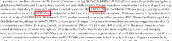 投标国防部的一项一阶段实验,在该项目书中明确提到了当年的非典SARS,和中东呼吸综合症MARS