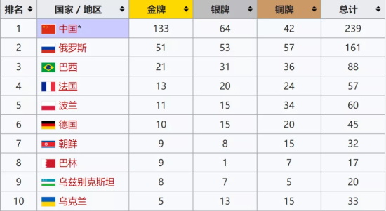 奖牌榜前十名都没美国,美国在第23名,共获得1金4银5铜的成绩