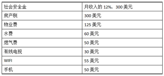 乔木居住在华盛顿一个县里,属于经济发达地区。他的一位邻居做家政的,每周工作6天,每小时12美元,一天96美元,一个月26天,不到2500美元。扣过税和社安,到手2100美元。