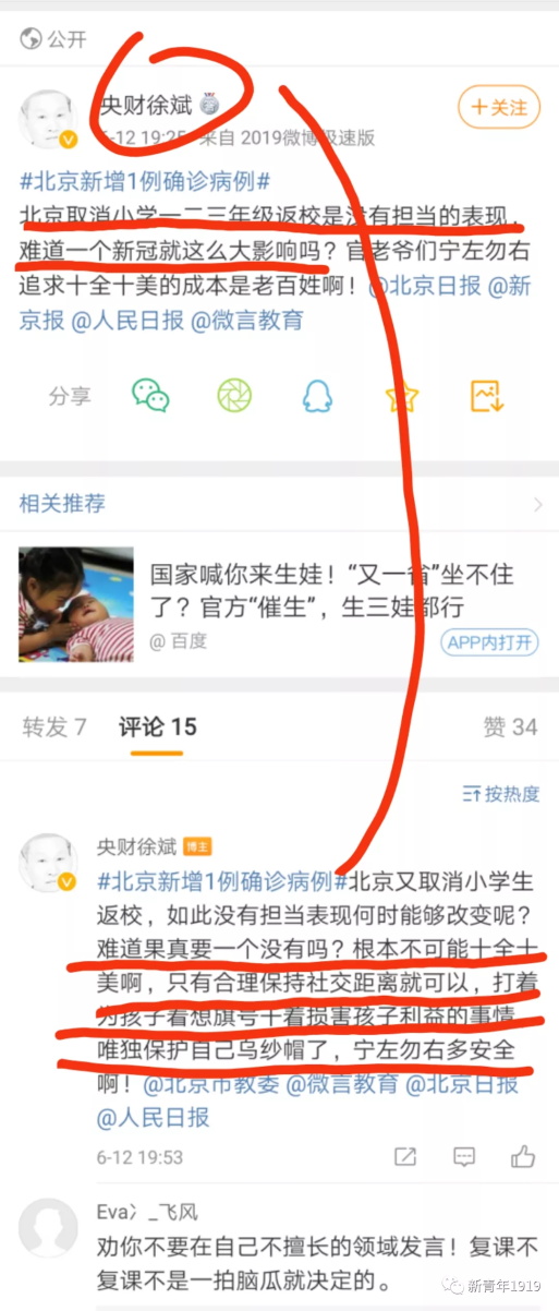 56天零报告的记录,被3例新增确诊者所打破!在这种情况下,本着对公众负责、对孩子的健康负责的态度,北京教委宣布:“暂停原定6月15日(下周一)小学一、二、三年级返校复课,暂停校外培训机构恢复线下课程和集体活动;已返校复课各学段、各年级目前继续坚持既定安排,根据疫情防控形势变化动态调整教育教学安排。”可就是这样的安排,竟然惹怒了微博认证为“央财徐斌”的徐老师,这位老师愣是给官方扣了这样一顶大帽子:没有担当!Are you kidding me?偌大的城市,新增3例,我们的政府在第一时间向全社会通告,发布确诊者轨迹,暂停六大批发市场营业;我们的教育部门在第一时间宣布暂停小学一、二、三年级返校复课,根据疫情防控的动态调整教学安排。这样的措施有何问题?为什么这位央财的徐老师在第一时间站出来怒斥政府没有担当呢?他言之凿凿说:“难道一个新冠就这么大影响吗?”“难道果真要一个没有吗?根本不可能十全十美啊,只要保持合理社交距离就可以,打着为孩子着想旗号干着损害孩子利益的事情,唯独保护自己乌纱帽了,宁左勿右多安全啊!”呵呵,看到堂堂央财的老师,发表如此“高谈阔论”,恕我冒昧,着实不敢恭维!新冠的影响有多大?国内就不必提了,从一月底开始蔓延全国的恐慌,现在回想起来还心有余悸,若不是有那么多逆行的医务工作者、志愿者、人民警察、解放军战士、社区干部、科技工作者、基建人员在前线顶着,那么,此时此刻的我们,恐怕就要面临美国人今天的窘境了:累计确诊2090499人,累计死亡116063人!正是因为我们的政府从上到下、万众一心,始终把人民生命安全放在首位,即便这背后的代价是惨痛的:一季度的GDP负增长6.8%,我们也没有丝毫的抱怨!因为,只要有人,就有希望、就有未来!更何况是孩子们的健康呢?可这位徐老师却说:“不可能十全十美啊,只要保持合理社交距离就可以!”真是站着说话不腰疼!您家有小学生吗?您家的小孩子在学校里安静到一动不动?即便是成年人,也未必能做到保持合理社交距离,苛求孩子们冒着感染新冠的风险到校复课?这就是央财老师给出的解决方案,说实在话,我真的不想骂人!想喷的人,总能找到喷的地方,连保护孩子的举措,都能被喷成:“打着为孩子着想旗号干着损害孩子利益的事情!”试问:孩子们晚几天开学,减少被感染的风险,就是损害孩子们的利益?这样的雷霆手段,都能被喷成是为了官员“自己的乌纱帽”!试问:是不是一定要政府放任不管,搞美国人的群体免疫,徐老师才开心呢?说老实话,我见过不要face的,没见过这样不要face的:如果真的因为不采取措施,导致疫情在孩子们中间蔓延,这群人又会跳出来怒骂政府不担当、不作为,哎,难呀!与这样的喷子讲道理,真的是对牛弹琴!我只是想弱弱问一句:“这位徐老师的观点,能代表央财的水平吗?”哦,你看我这急性,差点忘了,徐老师是央财的,搞财经的嘛:钱,肯定是第一位的;至于孩子们的命,算什么呢?说真的,今晚,我真的不想骂人!作者:明德先生3 来源:新青年1919