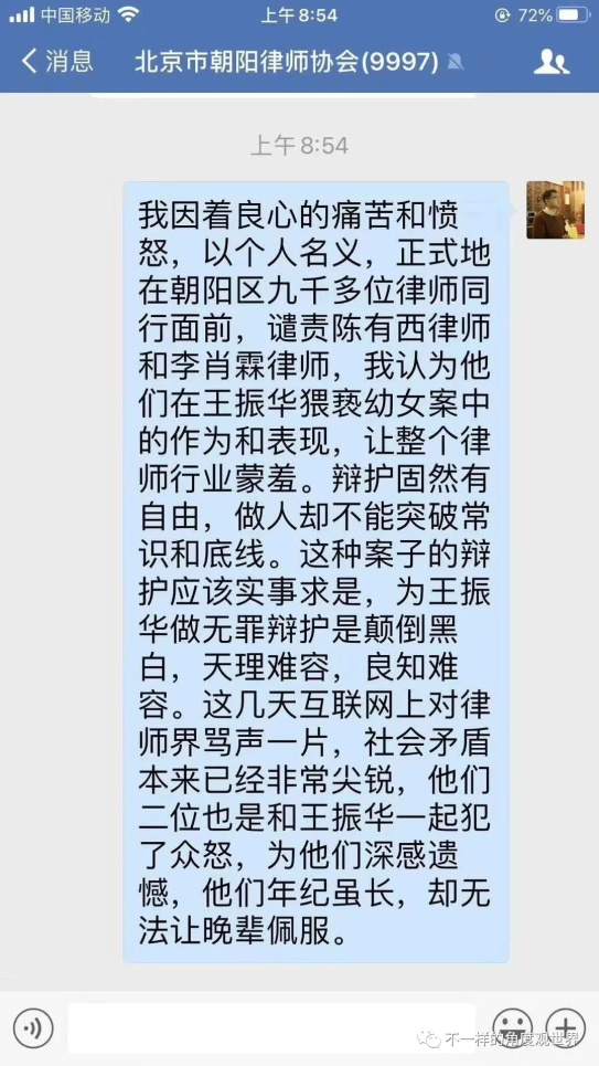 今天,更有律师在北京市朝阳区律师协会群里,实名谴责王振华律师。