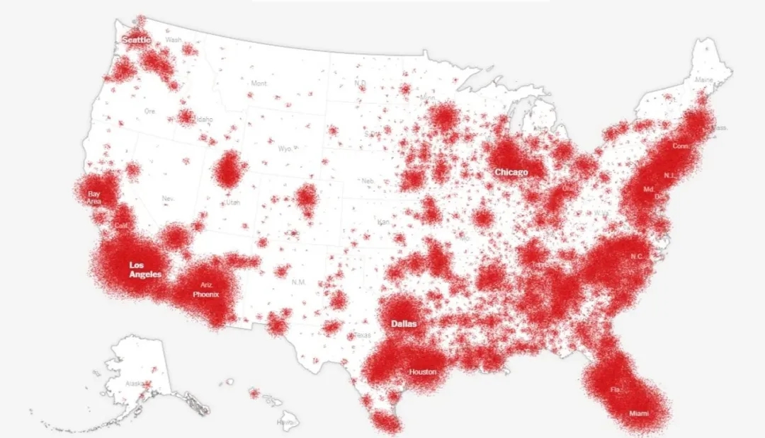 上图中的红点密度反映美国各州新冠病毒疾病确诊病例数密度。美国疾控中心主任雷德菲尔德6月25日透露,根据血清学调查显示,美国估计有5%至8%的人口感染新冠病毒,许多人没有症状或症状较轻。他对这一数据显示的疫情扩散程度,深感无奈。