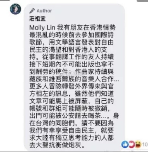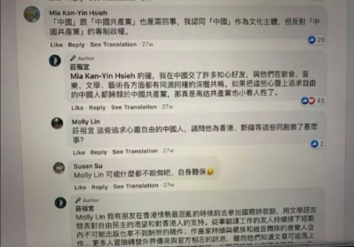 以及在脸书上转发其姐姐庄祖欣支持台独的言论。