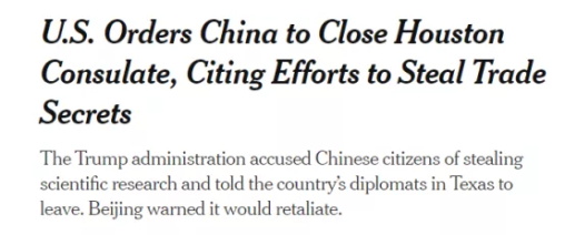 首先,就是不停地被污蔑伪造文件。 《纽约时报》报道说,中国驻休斯顿总领事蔡伟涉嫌伪造文件和作出不当行为,通过当地乔治布什国际机场的安全检查,护送多名中国旅客到一架包机的登机区域,指控他是间谍。