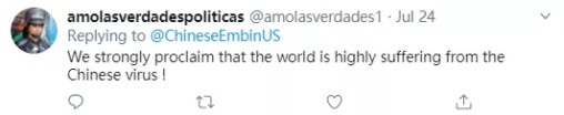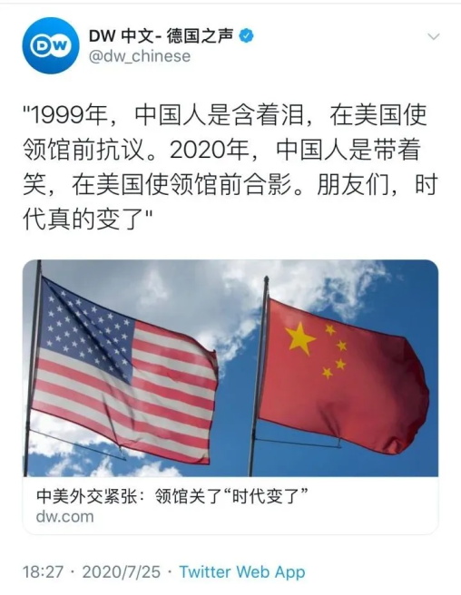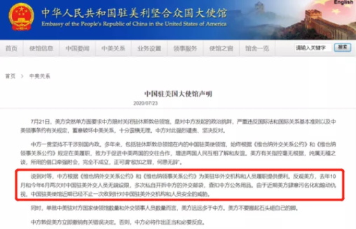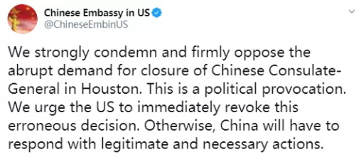 在7月22日华盛顿政府下令中国关闭驻休斯顿总领馆之后,中国驻美国大使馆官方推特在当地时间23日发布了一则推特消息,内容是: