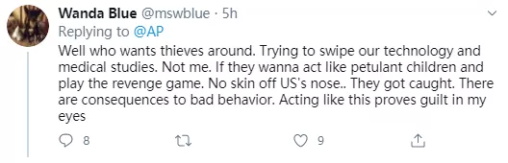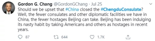 在中国宣布关闭美国驻成都总领馆之后,又有美国网友开始造谣: “中国关闭美国驻成都总领馆,我们应该沮丧吗?事实是,我们在中国的领事馆和外交设备越少,北京能劫持的我方人质就越少。近年来,北京一直在放纵自己的恶习,把美国人和其他国家的人当做人质。”