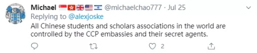 “世界上所有的中国学生和学者协会都被中国共产党大使馆以及他们的秘密机构控制了。”