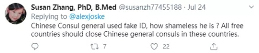 “中国总领事用假身份证,不知羞耻!所有自由国家都应该关闭中国驻这些国家的总领事。”