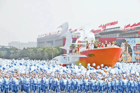 【2019年10月1日上午,庆祝中华人民共和国成立70周年大会在北京天安门广场隆重举行。图为群众游行中的“扬帆远航”方阵】