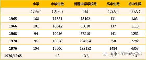 同时要看到的是,改革开放之前,从1965年到1978年,基础教育特别是高中教育规模大踏步地扩张,高中生数量从1965年的131万人增加到1978年的1484万人,十多年增长了十多倍。