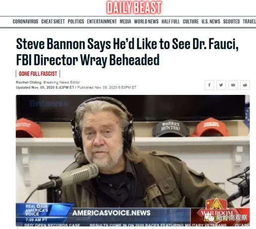 班农说,这一次混乱的总统大选,已经把我们的祖国美利坚这个伟大的国家逼入了绝境,再加上新冠疫情的扩散,致使整个国家,几乎都陷入了“万劫不复”的深渊,当前唯有揭竿而起,才能挽救整个美国。班农还声称,国家领导人已经命令联邦调查局(U.S Department of Justice)从即刻起做好抓捕拜登的准备。(至于何时抓捕,如何抓捕,班农没有明说)