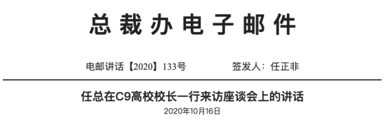 11月10日,华为对外公开了任正非于10月16日在C9高校校长座谈会上的讲话。
