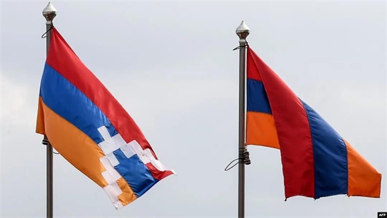 (纳卡地方自治政府旗帜(左)和亚美尼亚国旗)