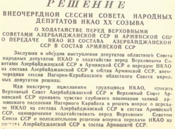在1988年2月20日,纳卡当地举行人民代表大会第二十届特别会议发起投票,当时大会有140名代表,亚美尼亚族有110人,而剩余的阿塞拜疆代表甚至被禁止参会,投票结果毫无悬念,但当时的莫斯科最高苏维否决了这个提议。