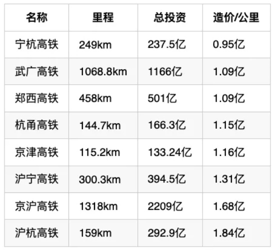 中国高铁加权平均单位成本为:时速350公里项目为1.29亿元/公里;时速250公里项目为0.87亿元/公里。