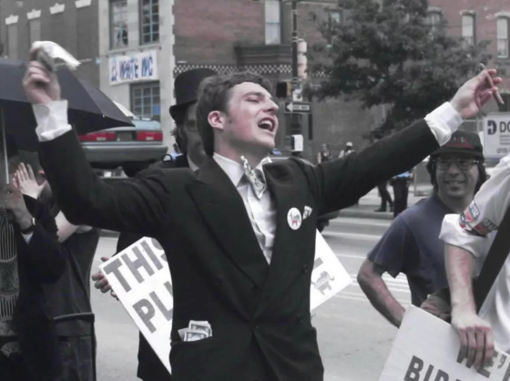 2000年7月31日,一位青年在美国费城市中心挥舞着美元,高呼“不管你们投谁的票,我们已经搞定了”,以此讽刺美国竞选中的政治献金、金钱交易操纵竞选。(新华社记者王岩摄)