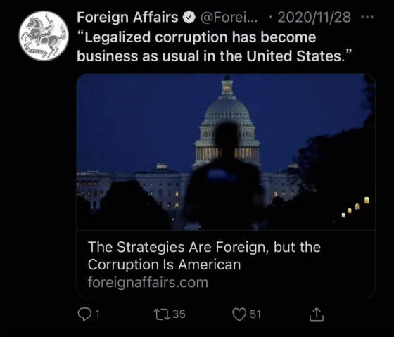 美国《外交事务》杂志刊文指出“合法腐败在美国已成常态”。虽然美国名义上有一套严格的防腐败法律法规,但有些腐败却可以在光天化日大行其道,不受法律约束。