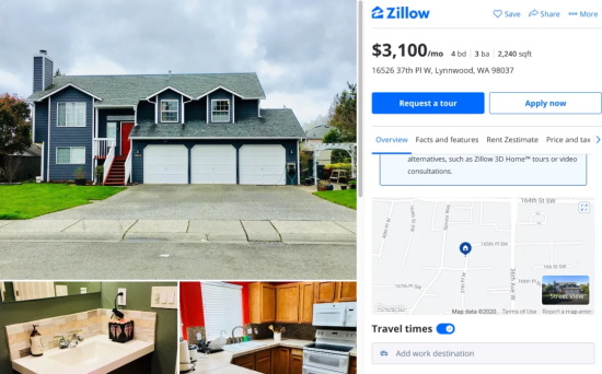 这套位于西雅图北部地区Lynnwood的独立屋市场估价约64万美元,每年房产税5200美元,以3100美元/月的租金挂牌出租,房子状况良好,预计很快会确定租客,我们也可以从这个案例了解一下当地的租售比