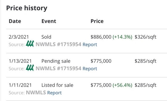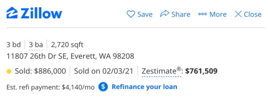比如下面这套房,Zillow给出的估价为76.15万美元,业主挂牌价77.5万,实际成交价88.6万,两天成交。我们可以从这些案例体会市场的疯狂。