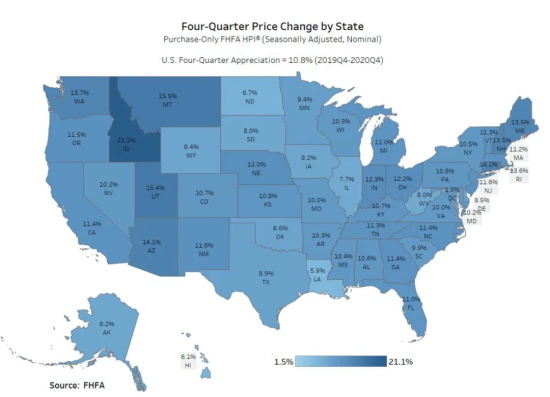 美国各州2020年四季度同比涨幅