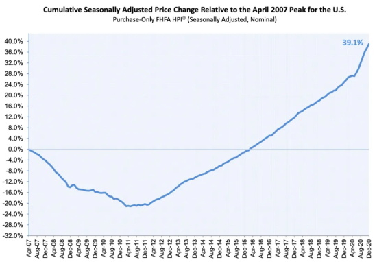 全美房价 2007年4月 - 2020年12月直到2016年4月 美国房价才回到2007年4月的水平 而且还没有考虑七年时间内的通胀因素