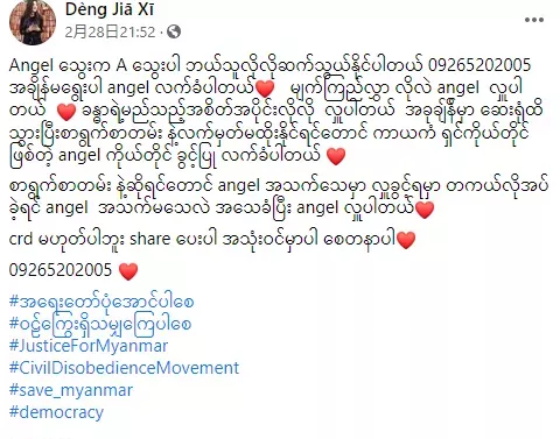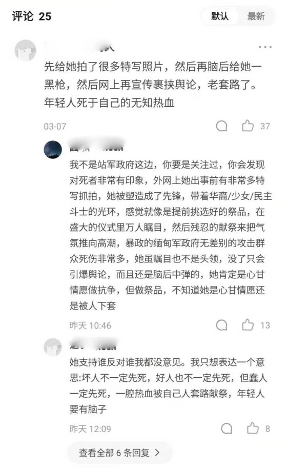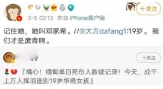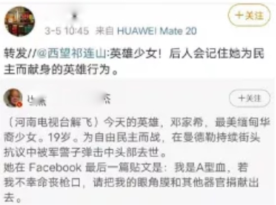 在公知们的包装下,这个本来平凡的女孩有了很多头衔:英雄少女,最美缅甸华裔少女,为自由民主而战的英雄,缅甸军警枪下的牺牲品……邓家希是谁?她的死怎么就成了“民主之光”?老蒋带大家扒开一层层迷雾,一起寻找真相。1邓家希父亲祖籍云南,母亲是果敢人。19岁的邓家希青春靓丽,能歌善舞,自己开设有跆拳道班,还有原创的舞蹈和MV。总体来说,她是个网红少女,在缅甸年轻人群体中,颇有不少粉丝。▲邓家希的女团只是,年纪轻轻的她却卷入了一场政治风波当中。我们知道,自从缅甸军政府拘捕昂山素季后,缅甸国内的抗议活动就一波接着一波。而邓家希,也是抗议人群中的一员。这个年岁的年轻人血气方刚,但血气方刚的另一面就是容易激动,被人利用。对美国人来说,利用年轻人搞事情什么的,最擅长了。缅甸政变第九天,邓家希就在脸书上放出缅甸军方总司令敏昂莱医院就医的图片,并写道:换做我是护士,宁愿豁上这条性命,也要给他注射毒药。用我的生命,死我一人,也好过整个缅甸沉沦至现在的模样。2021年3月3日早上,邓家希跟着别人来到曼德勒中心区的十字路口附近参加抗议活动,与军警对峙数小时。在抗议队伍中,邓家希无疑是最醒目的,因为她摘下了口罩,显得如此鹤立鸡群。邓家希冲在抗议人群最前面,大喊,“我们不会撤退”、“我们不能流血”。在西方记者照相机的环绕下,这位青春靓丽的华裔少女,仿佛成了为了这场街头运动的明星。只是,明星的背后,是血腥。12点20分左右,一颗子弹击中了她,一朵青春之花就这样凋零在混乱不堪的缅甸街头。当晚,邓家希的故事、倒下前的画面在西方社交媒体上掀起巨浪。无数网友转发她的最后一条推文:我是A型血......如果意外身亡,我授权捐赠所有的身体器官。▲图片来自观察者网风闻社区在这些炒作中,邓家希被塑造成了一个“皿煮女神”,一个殉道者。只是,邓家希那一身黑色的T恤,让中国人想到了2019年那场发生在香港的风波,怎么看怎么别扭。▲中间拿牌子者为邓家希而抗议者们的战术,更让中国人觉得无比熟悉。在所有的西方媒体语境中,邓家希是被缅甸军警射杀,“开枪镇压和平抗议群众”的帽子一下子就扣在了缅甸军警头上。可是经历了香港修例风波的中国人,已经不会再被西方舆论裹挟着走了。因为邓家希的死,疑点重重:1.邓家希直面军警,为何是脑后中枪?▲这名疑似凶手在周边抗议者转身慌张或逃跑或躲避的时候依然冷静站立四处观察2.那么多抗议者,为何这么多照片都是她的特写?按道理说,示威现场形势混乱,一片狼藉,不应该有摄影师专门针对她一个人来拍照。3.现场缅甸军警用的都是步枪,为何经验尸发现邓家希死于手枪?▲图片来自观察者网风闻社区4.她的最后一条推文到底是不是她发的?如果是,她是如何在断网的缅甸发了推特,如何精确预言了自己的死亡?如果不是,会是谁知道她即将死去?▲图片来自观察者网风闻社区最最诡异的是,邓家希身边的抗议者,都像香港的废青一样带着头盔和口罩,唯独邓家希没有戴头盔,还把口罩也拉到下巴以下,特意露出了完整的脸,这难道不反常吗?只是,这些疑点,都淹没在劈天盖地的悼念之中,甚至在国内,也有人把她奉为了英雄和女神。本来,老蒋是不惮以恶意来推测西方的。只是这一套做法,让老蒋觉得,太熟悉了,还是颜色革命原来的配方,还是熟悉的味道。讲真,缅甸人对政变不满可能是真的,但西方国家特别是美国的介入从根本上改变了抗议的性质。▲就连手势都和香港废青如出一辙邓家希的死,对对西方来说是一张很好的牌,一张站在大义上给缅甸施加压力的牌。而对缅甸军方来说,完全没有必要开枪射杀邓家希,因为这对自己没有任何好处。▲缅甸军警虽然应对游行不专业,但并不傻从抗议活动中的“包装”,到中枪死亡后的大肆炒作。我们不难推测,邓家希不过是西方国家特意挑选出来的“祭品”,专门为欧美的“颜色革命”献祭的。很可能在枪击前,西方已经选定了网红少女邓家希,但骗她说准备把她打造成“皿煮领袖”,所以邓家希才全程露脸,而且表现得特别积极。单纯的邓家希也许以为,经过媒体宣传,她就能成为周庭那样的“名人”。没想到,等待她的是一颗来自后方的子弹。2挑选“皿煮祭品”这一套,西方一直是驾轻就熟的。毕竟在颜色革命的指导手册中就清清楚楚记载着:如果不够暴力,就制造暴力;如果不够血腥,就制造血腥。这一套,西方的颜色革命指挥家已经使过不止一次了。比如在2014年,西方就曾成功实施过。2013年底,乌克兰政府宣布暂停与欧盟签署准成员国协定的准备工作,这一表态让亲西方的势力大失所望。一个NGO组织让一个乌克兰记者号召民众上街抗议。在西方人的印象中,这种街头抗议基本上做不到“和平示威”,一旦乌克兰军警动手,就是送上门的好牌。可是乌克兰“金雕”特种部队和警察非常高明,居然和平驱散了群众。2014年2月初,政府和反对派达成和平协议,决定提前大选,让国家恢复和平。这下西方就急了,辛辛苦苦搞了几个月颜色革命可能颗粒无收!2014年2月20日,乌克兰基辅独立广场发生一起不明狙击手枪击示威群众、维持秩序警察的恐袭事件,造成严重人员伤亡,致53人死亡,其中49人为示威者,4人为警察。和这次缅甸一样,西方直接把悲剧归咎于“时任乌克兰总统维克多•亚努科维奇的政权”,直接促成