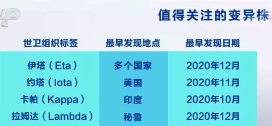 除了四种“值得关切的变异株”,世卫组织还列出了4种次一级的“值得关注的变异株”。