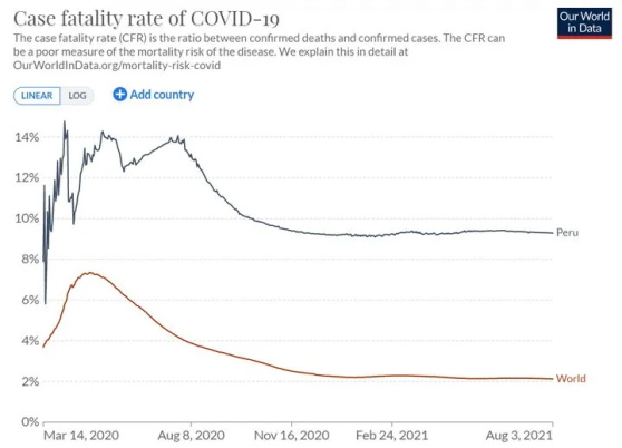 这张是随手在ourworldindata网站上截的病死率变化趋势图,纵轴是病死率,黑色曲线是秘鲁的病死率,红色曲线是作为对照的全世界平均病死率。
