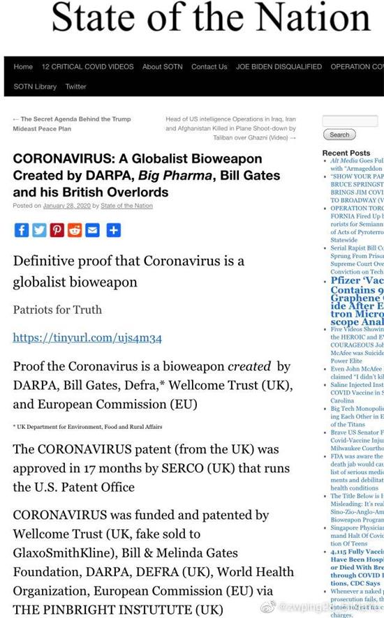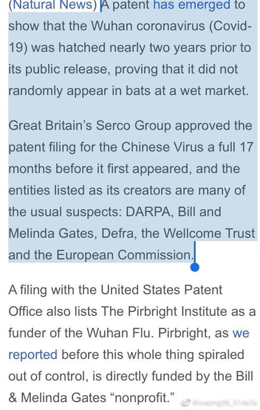英国赛科集团(Serco Group)在新冠病毒首次出现前整整17个月就批准了它的专利申请,被列为其发明者的实体有很多常见的可疑之处:美国国防部高级研究计划局(DARPA)、比尔和梅林达·盖茨(Bill and Melinda Gates)、英国食品与环境事务部(Defra)、维康信托基金(Wellcome Trust)和欧盟委员会(European Commission)。