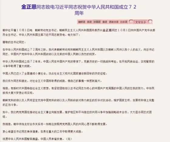 据朝鲜中央通讯社报道,朝鲜劳动党总书记、朝鲜民主主义人民共和国国务委员长金正恩同志10月1日向中国共产党中央委员会总书记、中华人民共和国主席习近平同志致贺电。