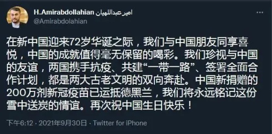 “祝中国生日快乐!”伊朗外长阿卜杜拉希扬当地时间9月30日用中文发推祝贺中华人民共和国成立72周年。
