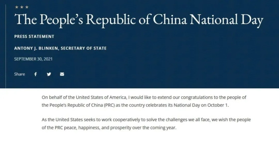 当地时间9月30日,美国国务卿布林肯发表声明:“在中华人民共和国10月1日庆祝国庆日之际,我谨代表美利坚合众国向中华人民共和国人民表示祝贺。美国寻求合作解决我们共同面临的挑战,祝愿中华人民共和国人民在未来的一年里和平、幸福和繁荣。”