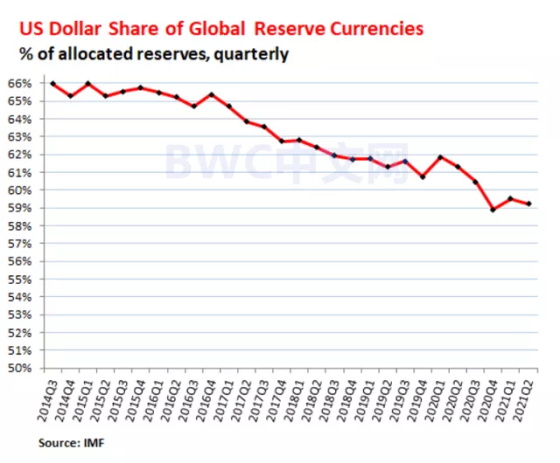 因此,在上述背景之下,美元储备地位也变得岌岌可危。据IMF9月30日公布的最新数据显示,美元第二季度在全球外汇储备中的占比已经下降至59.2%。而在本世纪初时,美元在全球储备份额占比高达73%。显然,对于美联储来说,如何规避美元地位下降,并转嫁美国市场上的债务风险已经显得迫在眉睫。