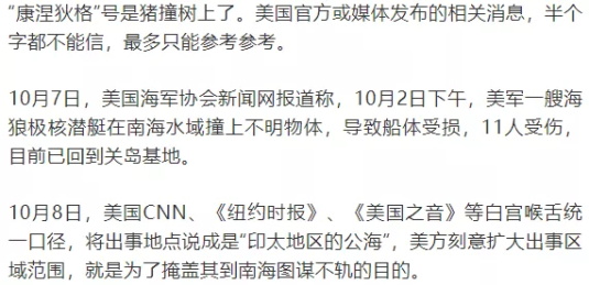 前几天美国的核潜艇到中国南海来,受伤了。老张开车去东北,撞了之后,美国的海洋测量洋船又来南海了,美国干嘛呀?怎么理解这事啊?我做了几期节目,但觉得自己理解得太肤浅。昨天晚上我看后沙月光对于这事的分析看得我直笑,太高了。