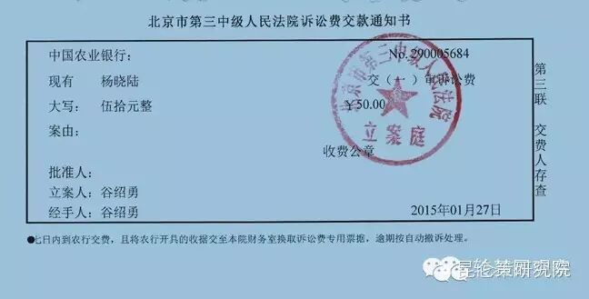杨晓陆特意转来了三中院诉讼费交款通知书,其中写到“七日内到农行交费,且将农行开具的收据交至本院财务室换取诉讼费专用票据,逾期按自动撤诉处理。”另一张人民法院诉讼收费专用票据显示,本起案件的受理费、申请费为50元,诉讼收费单位为北京市第三中级人民法院。
