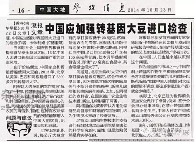 《参考消息》2014年10月一篇文章曾发出警告《中国应加强转基因大豆进口检查》,文章提到,世界卫生组织说,每公斤大豆含有的草甘膦应低于20毫克。然而,阿根廷向中国出口的大豆每公斤含有100毫克草甘膦,13亿中国人因进口转基因大豆面临严重的健康风险。