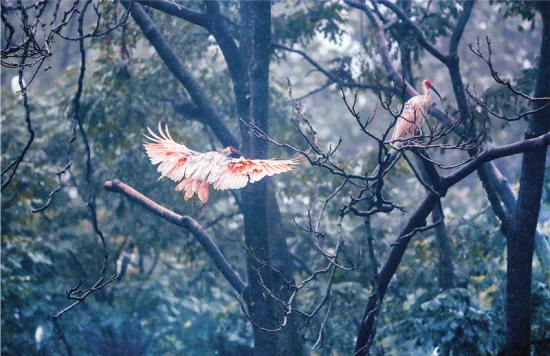陕西省汉中市洋县被称为“朱鹮之乡”。近年来,当地政府把涵养生态作为第一要求,出台一系列优惠政策,鼓励企业和合作社参与有机产业发展。如今,曾几近灭绝的朱鹮,从最初发现的7只繁衍到全球种群数量5000多只,其中洋县境内达2000多只,有机产业也成为带动贫困群众脱贫的主导产业。图为洋县陈家村附近归巢的朱鹮(2020年8月1日摄)。新华社记者 兰红光/摄