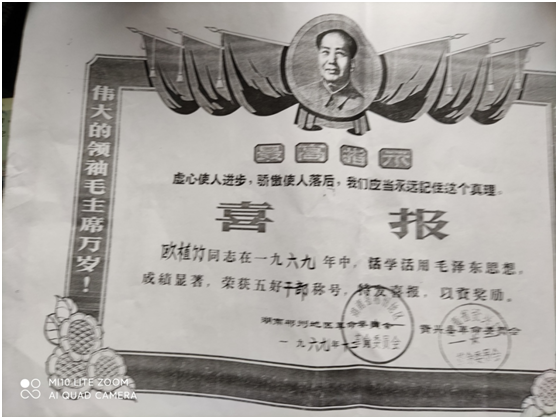 思想一通,行动也就积极了。我在生产队劳动半年多,出工率比社员还高。因为社员总有家务亊要请假,而我和妻子,除了公社有时开会通知我们下放干部也参加这种情况很少),其他时间我们每天上午下午都出工。后来,我被抽到县革委机关协助工作﹙我是地区下放干部,所以叫协助他们工作﹚,我也没有“做客思想”,而是积极努力,勤勤恳恳,任劳任怨,尽力把工作做好。从而得到了领导和同事的好评,把我评为活学活用毛泽东思想的“五好干部”,奖状上盖了资兴县革委和郴州地革委两颗大印。