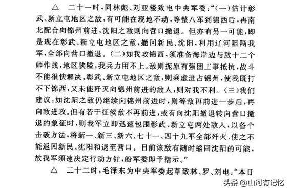 需要特别提一下,我军攻克锦州之后,将原定改打锦西、葫芦岛之敌,转向辽西会战,是林罗刘于10月19日21时提出的。由此,原来的锦榆唐战役转为我们看到的辽沈战役。