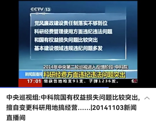 2014年中央巡视组对中科院展开巡视,巡视中发现中科院存在不少突出问题,期中之一就是“国有资产权益损失问题比较突出”,现在还能搜索到当时的新闻报道。