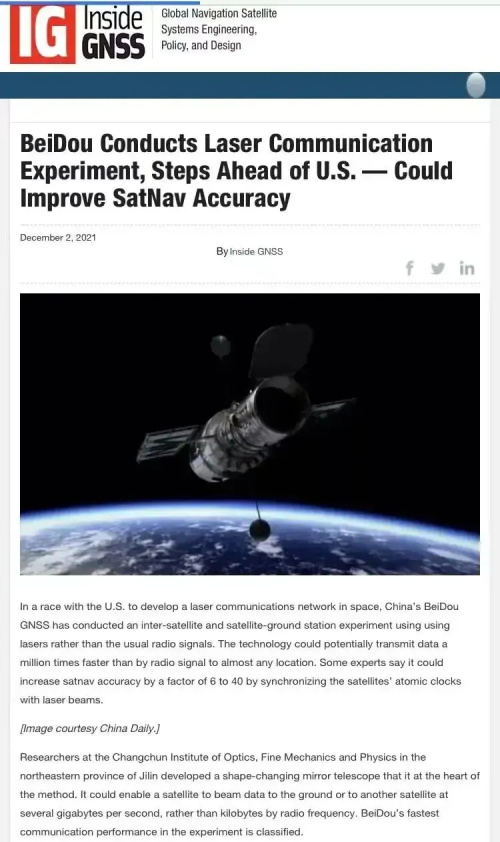 近日,美媒报道:中国北斗首次通过激光代替无线电信号进行星地通信,传输数据比无线电快100万倍,卫星导航精度提高4000%,在这一领域领先于美国。报道称,激光通信理论上每秒最多可以传送接近1TB的数据,还能够有效抵御外国窃听和电子战攻击。一位不具名的中国科学家评价称:“这是具有革命性的突破。”
