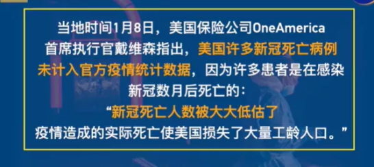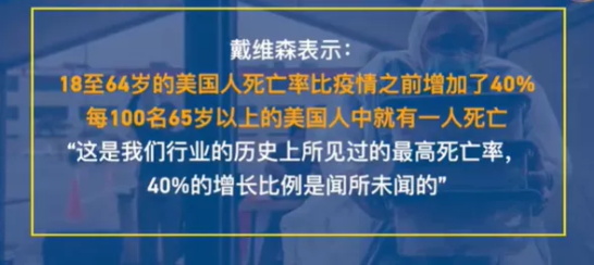戴维森还强调称18至64岁的美国人死亡率比疫情之间增加了40%。他说“这是我们行业的历史上所见过的,最高死亡率40%的增长比例是闻所未闻的。”
