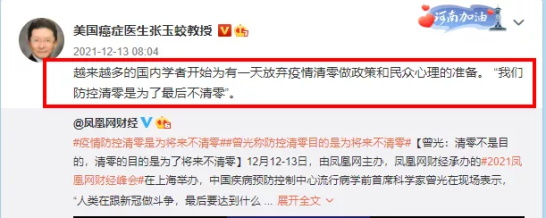 北京时间去年12月13日的帖子,他转@凤凰网财经 的关于“曾光称防控清零的目的是为了将来不清零”的帖子时评论称“越来越多的国内学者开始为有一天放弃疫情清零做准备”。