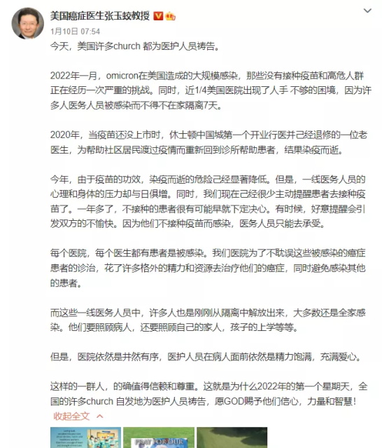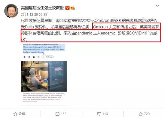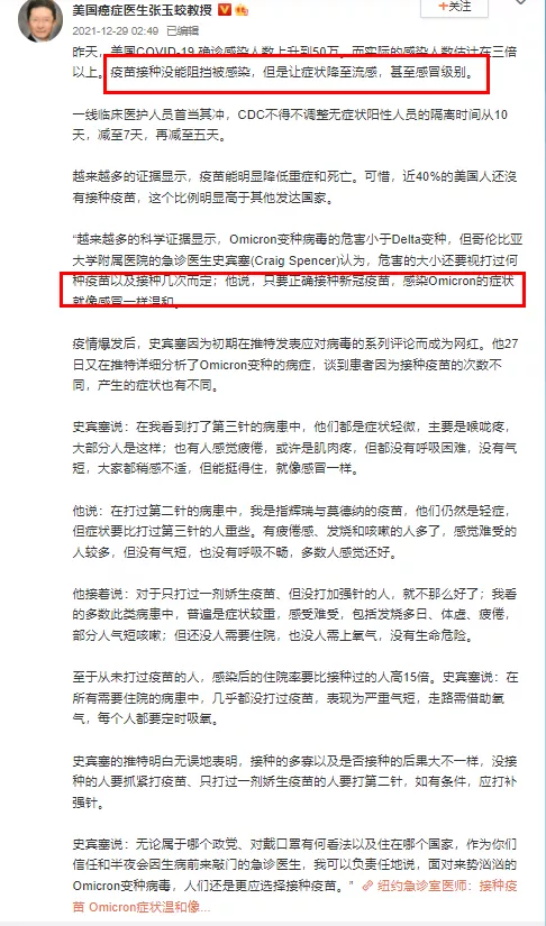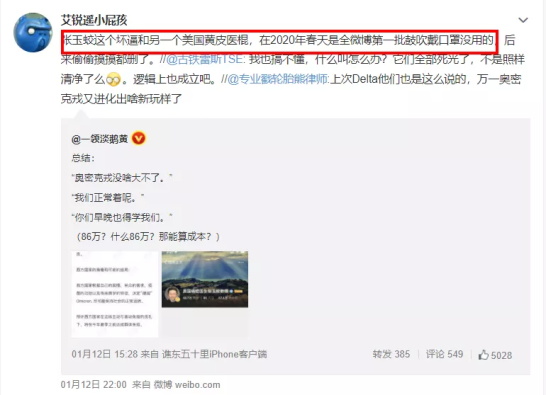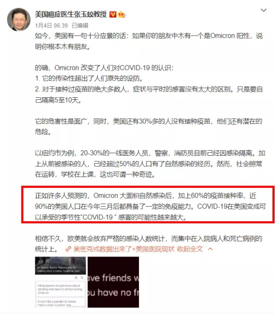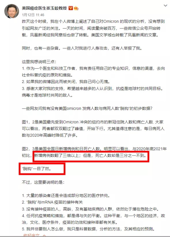 然后,在北京时间去年10月8日,张玉蛟这个美国医生在他自己的微博上发布了文章《2022年,应该继续“疫情清零”还是开始学会“与狼共舞”?让数据说话》。
