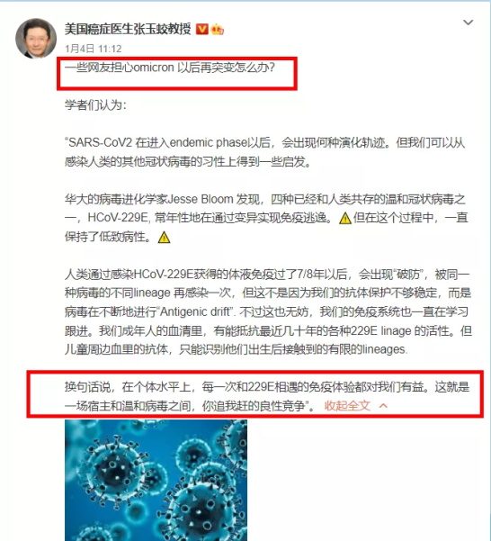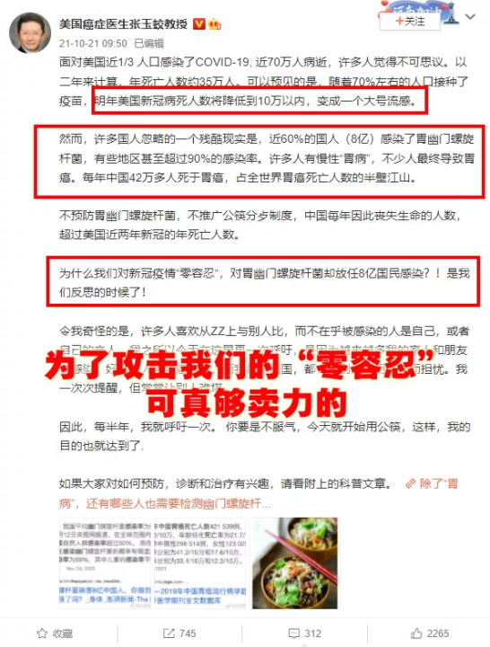 显然,这是典型的恶意解读,因为曾光说的“防控清零的目的是为了将来不清零” 的“不清零”和这个美国华裔医生嘴里一直说的“放弃清零”完全是两个概念,不是一码事儿。